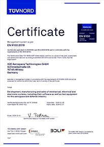 In kaum einer anderen Industrie gelten so hohe Maßstäbe für die Qualitätssicherung wie in der Luft- und Raumfahrt. Mit regelmäßigen internen und externen Audits stellen wir sicher, dass die einheitlich hohen Qualitätsstandards im Unternehmen lückenlos eingehalten und kontinuierlich verbessert werden. Im Zentrum steht dabei die Zertifizierung nach EN 9100, welche uns eine Qualitätssicherung und Prozesssicherheit nach höchsten Leistungsstandards bescheinigt. Mit dem Zertifikat sind wir gleichzeitig in der OASIS-Datenbank der IAQG (International Aerospace Quality Group) gelistet.